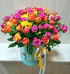 Пышный букет из роскошных розовых бутонов в изящной круглой коробке уже давно стал не просто красивым, а поистине оригинальным и модным подарком для девушки. Утонченные объемные разноцветные головки на изящном зеленом стебле плотно прилегают друг к другу, создавая элегантную многогранную композицию. Они балуют своим изяществом, миниатюрностью и неординарными цветовыми сочетаниями. Все оттенки розового, красного и оранжевого превосходно сочетаются и отличаются неподдельной стойкостью. Изюминкой букета являются нераспустившиеся бутоны, которые позже придут на смену раскрытым бутонам. Ваша дама будет в восторге от такого подарка!